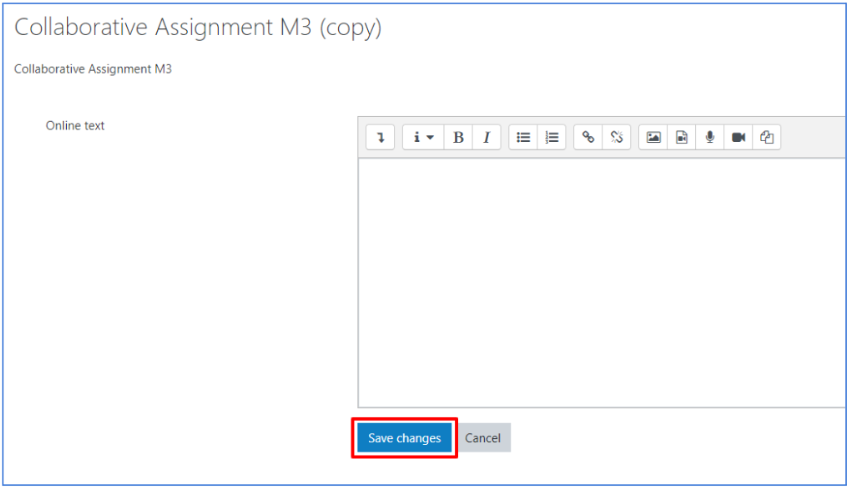 Depending on the type of assignment, you will be asked to either upload one or more file(s), or to type some text in an open field. The picture below shows a text assignment example. When you finish working on your assignment, click “Save changes”.